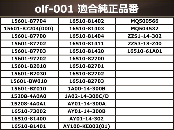 ※使用狀況によりもう少し早いサイクルで交換した方が良い場合も御座います。 ※純正互換品のため、カップレンチが合わない場合がありますのでフレキシブルタイプのレンチを用意してください。 ※記載の車種はあくまで參考車種です。ご注文前に必ず純正品番をご確認ください。 ※製品お屆け時、取り付け前に再度誤りが無いかご確認ください。 ※製品取付け後は、お屆け間違いであっても返品?交換はお受け出來ません。 |