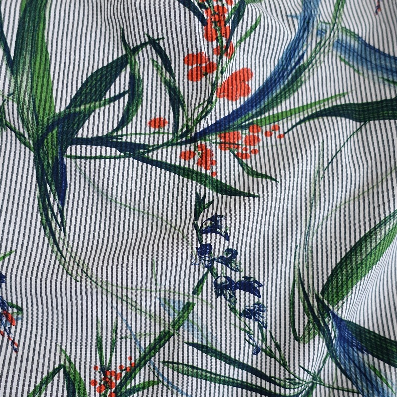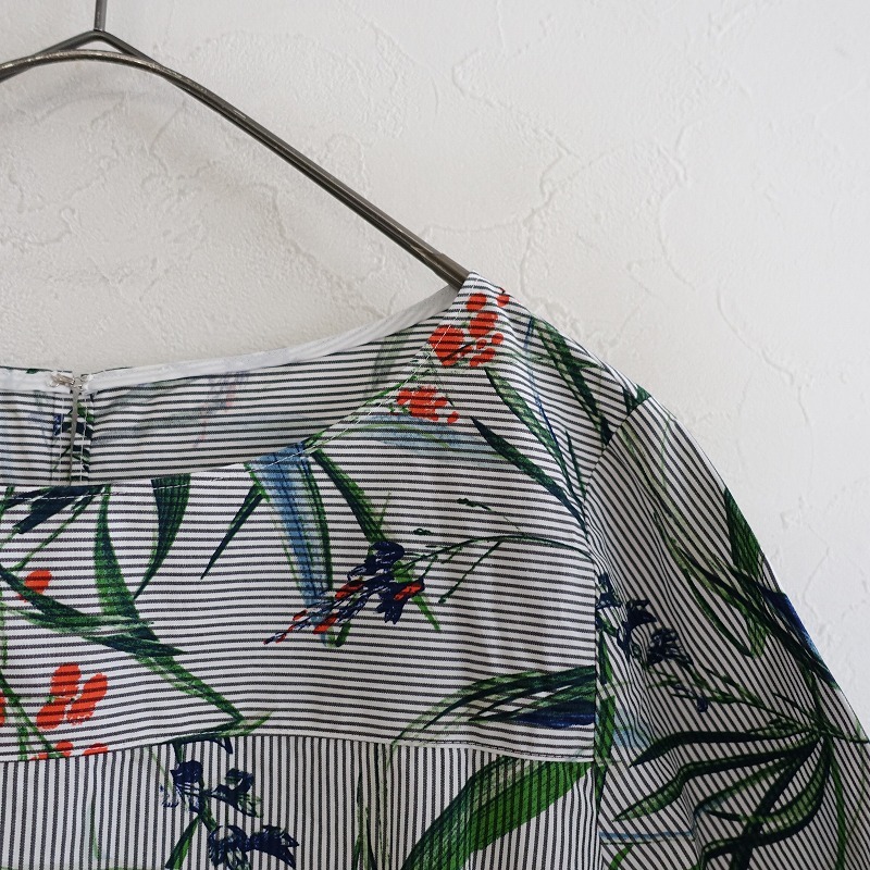 | LAUTREAMONTのコットンプリントフレアスリーブプルオーバーブラウスです。カラーはチャコールグレー×ホワイトのストライプ柄地にグリーン?オレンジ?ネイビーなどのプリント入りで、布帛地です。フレアスリーブデザインで、胸元&背上部に切り替えが施されております。バックネックにフック一つ付きのプルオーバータイプで著脫でき、裾はラウンドカット仕様で、後ろ裾丈が長(zhǎng)めです。 |