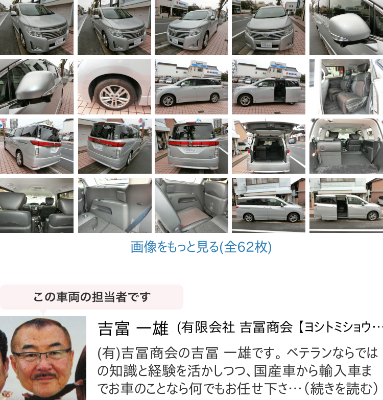 ▼販売店コメント | 日産 エルグランドは、信頼のワンオーナーで大切に管理されてきた一臺(tái)です。平成22年式、走行距離88348kmとしっかり使用され、シルバーボディがまだまだ輝きます。広々とした空間を提供するミニバンスタイルには、安心安全の裝備が充実。ABS、全周囲カメラ、トラクションコントロール等を完備し、ご家族との快適なドライブをサポート。車検満タン付きで、そのまま長くお使いいただける安心の一臺(tái)です。 ご覧頂きありがとうございます。 ■この車への「お問合せ」?「無料見積り依頼」、「在庫確認(rèn)」は、お?dú)葺Xにどうぞ! ■この車両以外にも「車選びドットコム」におすすめの中古車を掲載しております。 他の在庫車種、お店へのアクセスは【販売店情報(bào)ページ】をご覧ください。 問合わせ?來店の際には「中古車情報(bào)サイト(車選びドットコム)を見た」とお伝えください。 店頭商談中?売約済の場合もありますので、ご來店の際は事前にお問合せ頂き、該當(dāng)車両の有無をご確認(rèn)ください。