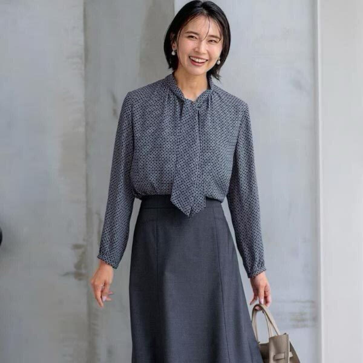 クラッシックな印象のスクエアチェーンプリントのボウタイブラウス。