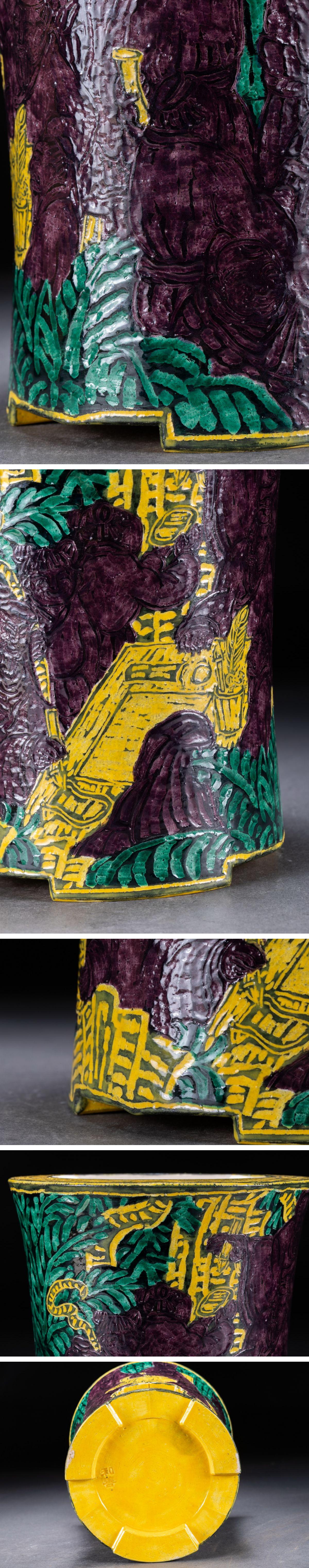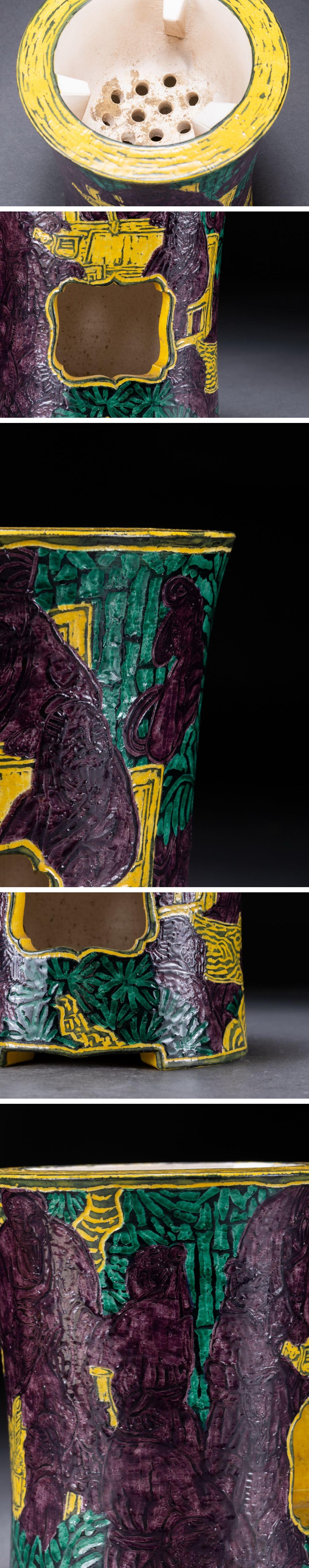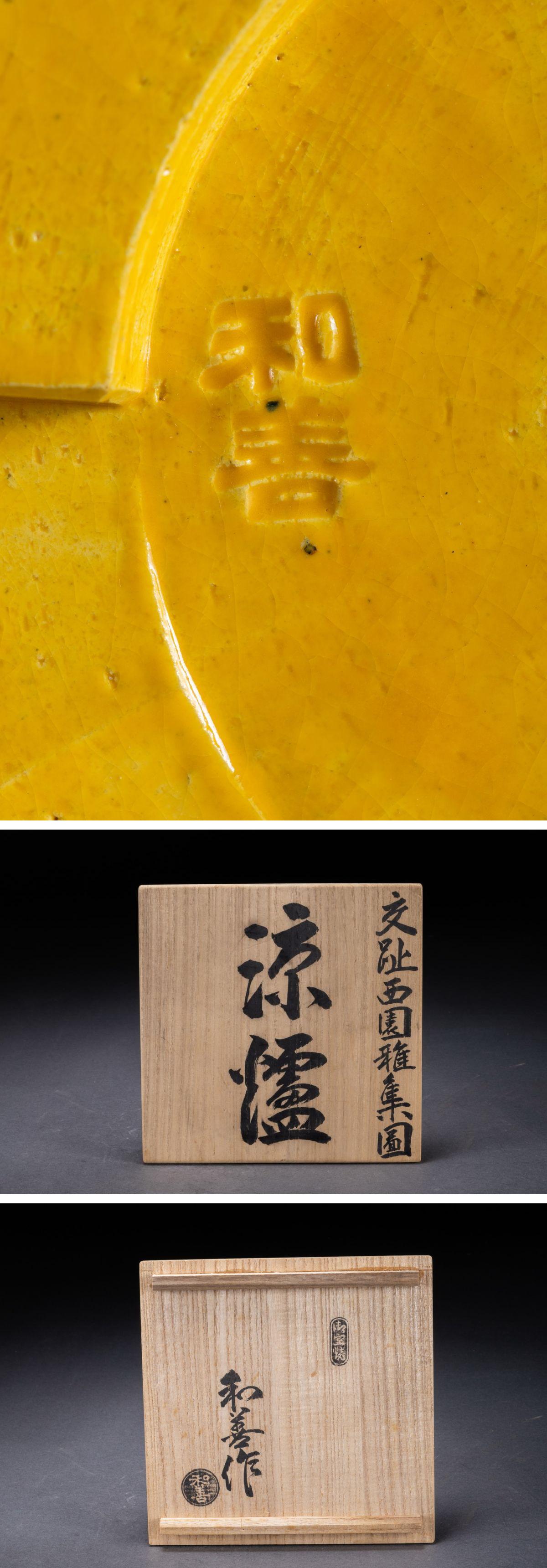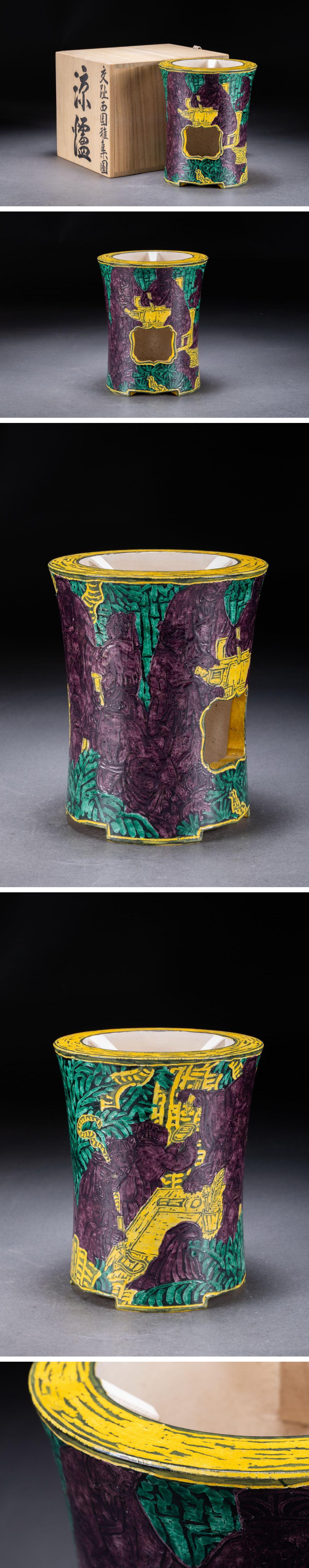 【華】時(shí)代舊藏 時(shí)代物「和善」作 黃交趾西園雅集図 涼爐 共箱 茶煎道具 時(shí)代物 古美術(shù) 骨董品A25070243-TQ