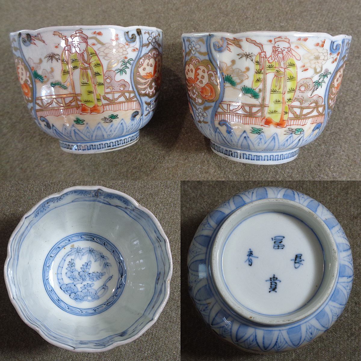 【福雀】01【古伊萬里 染錦 金彩 色絵 蕎麥豬口 小鉢 向付 輪花小鉢 賢人図 見込松竹梅 9客 冨貴長春】時代物 江戸期
