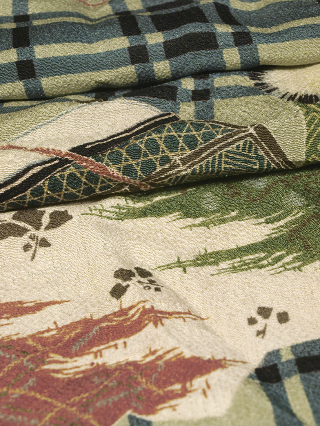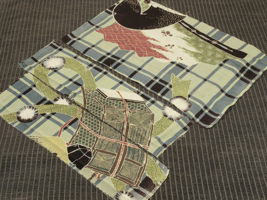 裏葉柳(うらはやなぎ)色の地に格子縞と歌舞伎の演目『勧進(jìn)帳』の小道具の文様が染められている、縮緬のはぎれです。切り分けれられた 3 枚 1 組です。 大正から昭和初期ごろにつくられたと思われるお品です。義経の檜笠の斑蓋(はんがい)、弁慶や四天王たちのつづらの笈(おい)、冠の頭襟(ときん)、扇子の中啓(ちゅうけい)、そして冨樫の烏帽子(えぼし)などが象徴的にあらわされている、おもしろみのある意匠です。シボの大きな縮緬地です。 両耳、両端付近に縫い跡があり、最も大きな布地の下端上の左右中央付近に直徑約 3-5mm のヒケ穴気味の部分が各 1 か所あります。そのほかに目につく大きなしみやよごれ、褪色などのダメージはなく、全體的にはきれいな狀態(tài)です。生地の力もあります?!L(fēng)楽の出品內(nèi)で配置違いの柄の異なる共布を出品している場合もあります。 |