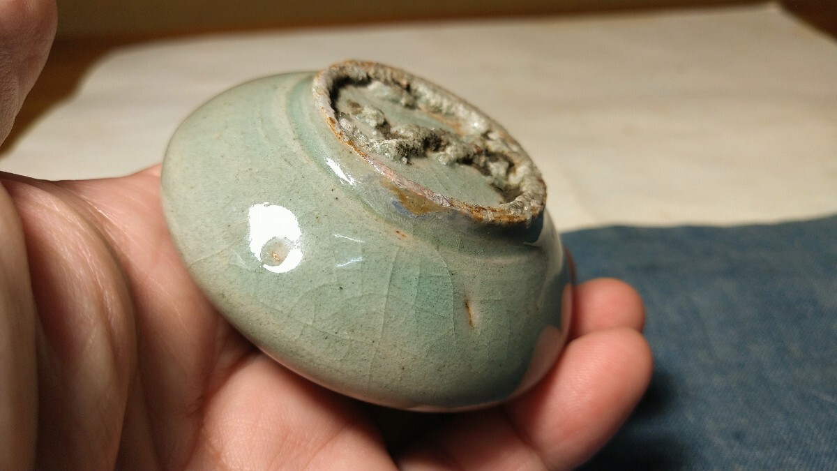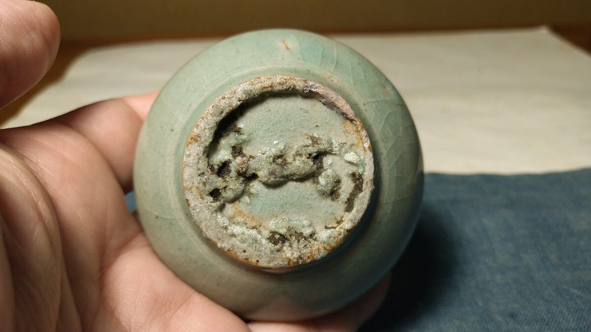 高麗青磁の鉄絵白象嵌の油壺です。地色の釉色も上々です。施されている模様は一旦花も葉も鉄絵で描きその後で花部分のみに凹みを入れ白泥を象嵌しています。単なる白黒象嵌と異なり大変珍しく手の込んだ技法です。無傷と言って良い狀態(tài)です。指先に吸い付くような釉肌も厳しい口辺の作りも上手ならではです。比較してこそ分かる上手技法の高麗青磁鉄絵白象嵌油壺を特別出品です。箱あり。?胴徑7センチ?高さ4.2センチ?高麗時(shí)代(12?13世紀(jì)) ※新規(guī)の方、評(píng)価の悪い方の入札は取り消す場合があります。商品到著後は速やかに取引ナビの受取連絡(luò)を入れて下さい。