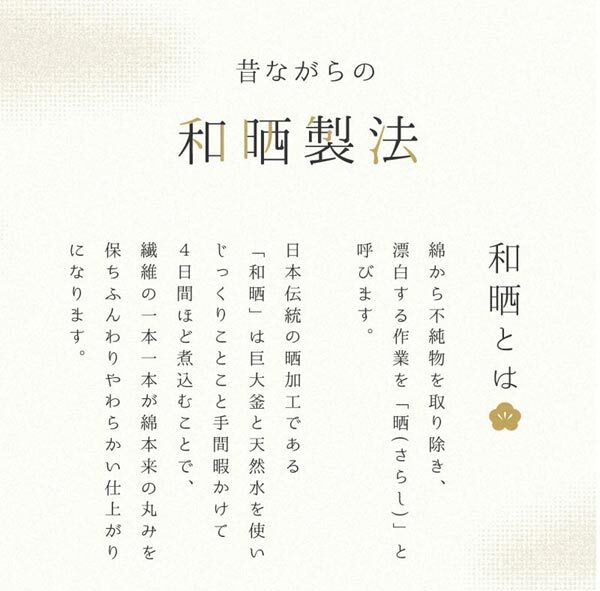 | 內(nèi) 容 | ■ウエスティ 和曬一重ガーゼ 掛布団カバー ダブルロング(69301) ■サイズ:190×210cm ■組成:綿100% ■カラー:アイボリー ■仕様:8か所ホックテープ付、全開ファスナー ■日本製 羽毛布団との相性バッチリ! 昔ながらの和曬(わざらし)製法で作られたガーゼのカバー。 日本伝統(tǒng)の曬加工である「和曬」は、巨大釜と天然水を使い、 じっくり手間ひまかけて4日間ほど煮込むことで、 繊維の1本1本が綿本來の丸みを保ちふんわりやわらかい仕上がりになります。 また、繊細(xì)な肌觸りの2重ガーゼはほどよく汗を吸収し、ムレを逃がして濕度を調(diào)節(jié)。 最初はパリッとした風(fēng)合いですが、 繰り返し洗うたびにふわふわ?くったりと柔らかく育つのも魅力。 やわらかく通気性の良いガーゼのカバーは、 羽毛布団の軽さ?暖かさを最大限に発揮させてくれます。 スナップボタン紐&全開ファスナーで著脫もらくらく。 ※パッケージのラベルが異なる場合があります |