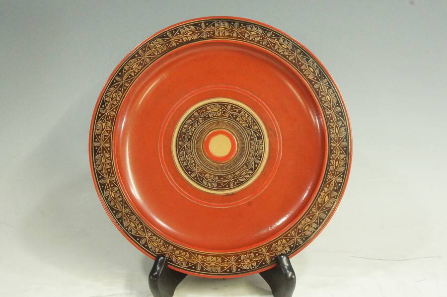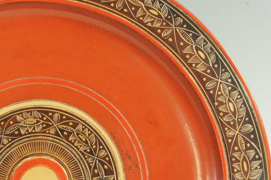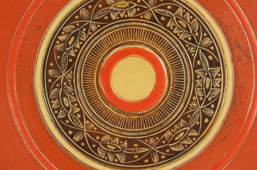 円形の獨楽模様に色漆を塗り分け、