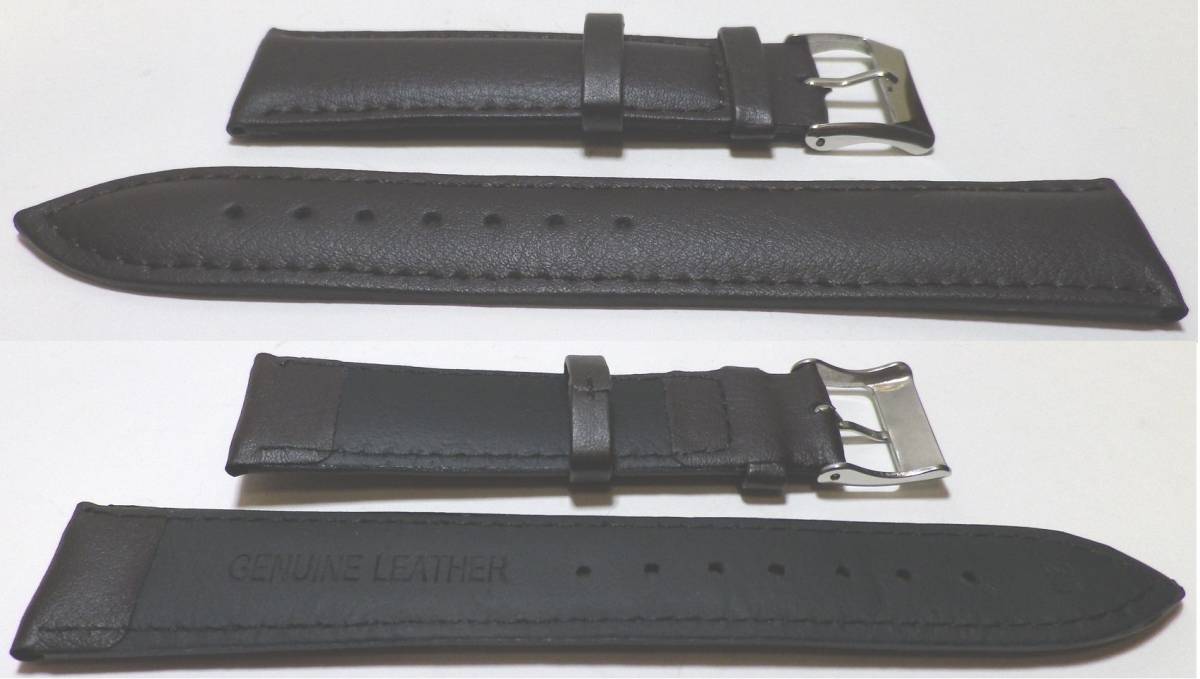 | 牛革替えベルトです。色はダークブラウン(こげ茶色)です。大変肉厚な革のベルトです。レザー(GENUINE LEATHER)の刻印あり、尾錠は大型でシルバーです。裏地は耐汗素材です。新品のバルク品です。新型の上級タイプのばね棒はずし、新品の20ミリのばね棒(1組2本)付きです。ベルト、ばね棒、上級ばね棒はずしの3點セットとなります。**こちらのベルトは肉厚ですが重量のある時計には向きません! size