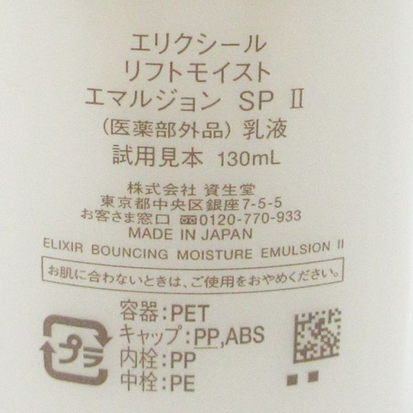 資生堂 エリクシール リフトモイスト エマルジョン SP II 130ml 未使用 F14 エイジングケア*。ハリとうるおいに満ちた「つや玉」続く肌へ。薬用乳液。厳選された美容成分配合で、肌にハリを與えながら、浸透処方で角層深くまでうるおいを屆けます。*年齢に応じたうるおいケア
