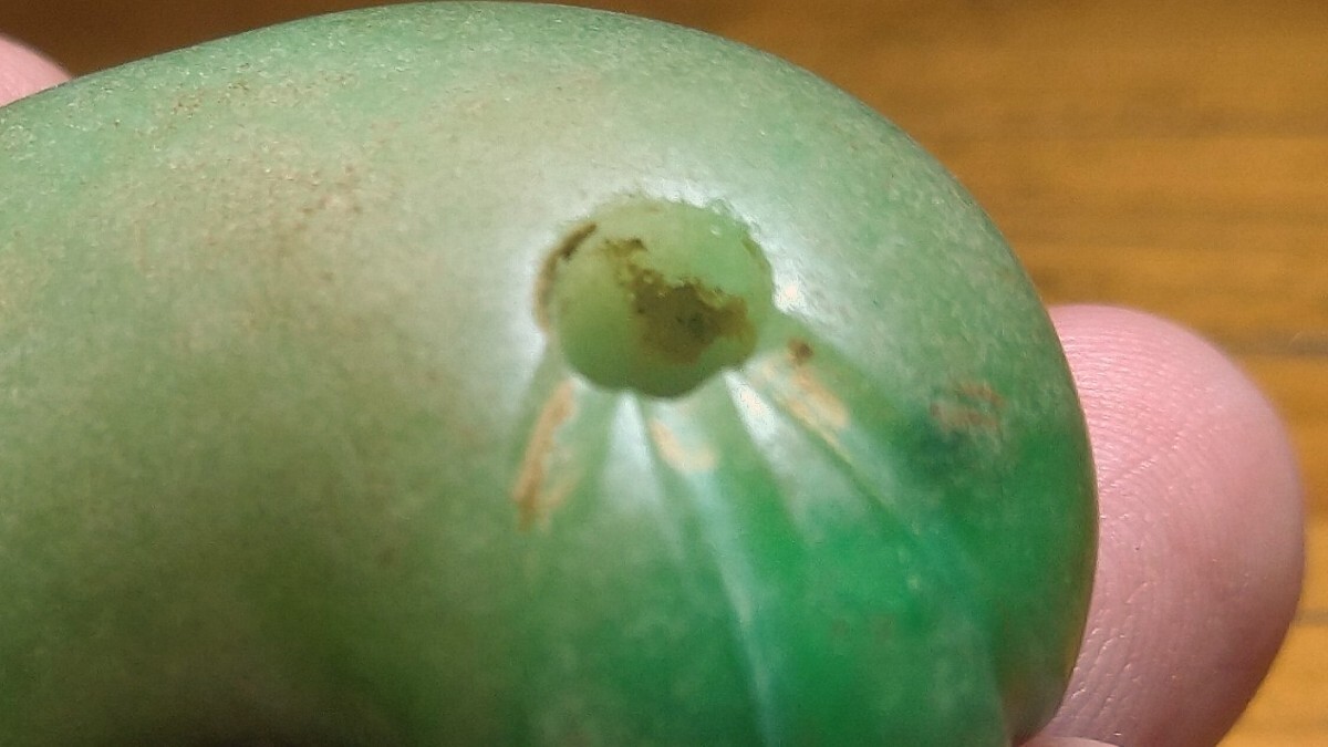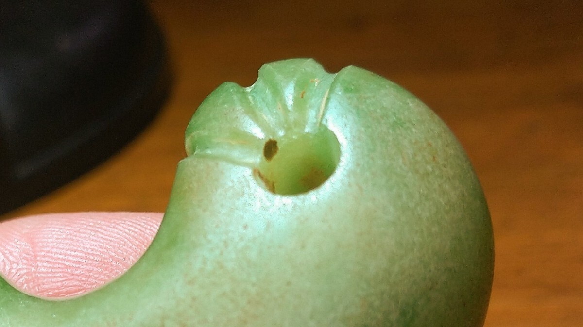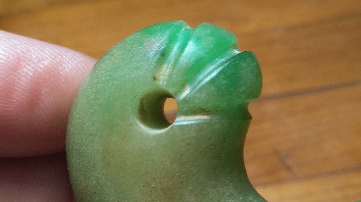 翡翠の丁字頭の勾玉です。少し前に別々に2點(diǎn)出品落札されました勾玉と3點(diǎn)同時(shí)購入の物でこちらが最後の1つです。太形で大振りで前回の物より二周りほど大形です。シャープな片側(cè)穿孔です。線刻の後彫りを疑いましたが、いたずらで入れたような弱々しさがなく深く力強(qiáng)くシャープで線刻の角に風(fēng)化も見られることから製造當(dāng)初からの物のようです。裝飾品として他の勾玉や小玉等と共にいくつか繋がれた中でも中心に置かれた物と思われ、ただならぬ品格と迫力が伝わってきます。白っぽい部分に光をあまり透過しない部分もありますが全體の7割程は光を透し透明感のある瑯かん質(zhì)で美しい緑です。家寶として愛蔵していただきたい太く大振りな瑯かん質(zhì)の硬玉製丁字頭勾玉を特別出品です。?長さ5センチ?厚さ1.7センチ?古墳時(shí)代 ※今週は出張の関係で土曜終了分に優(yōu)品を多く出品いたします?!乱?guī)の方、評(píng)価の悪い方の入札は取り消す場(chǎng)合があります。商品到著後は速やかに取引ナビの受取連絡(luò)を入れて下さい。
