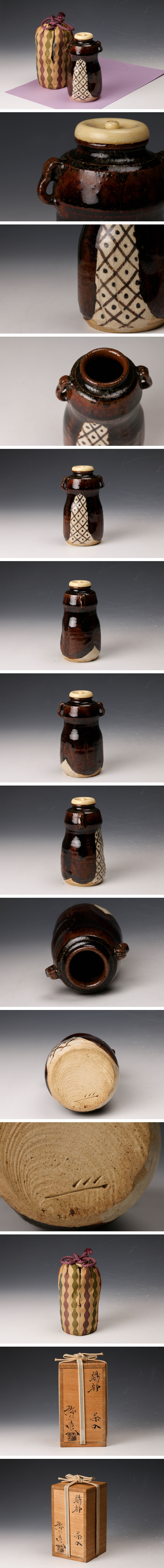 【佳香】加藤?gòu)浻倚l(wèi)門(mén) 織部茶入 共箱 仕覆(萬(wàn)葉華文) 茶道具 本物保証