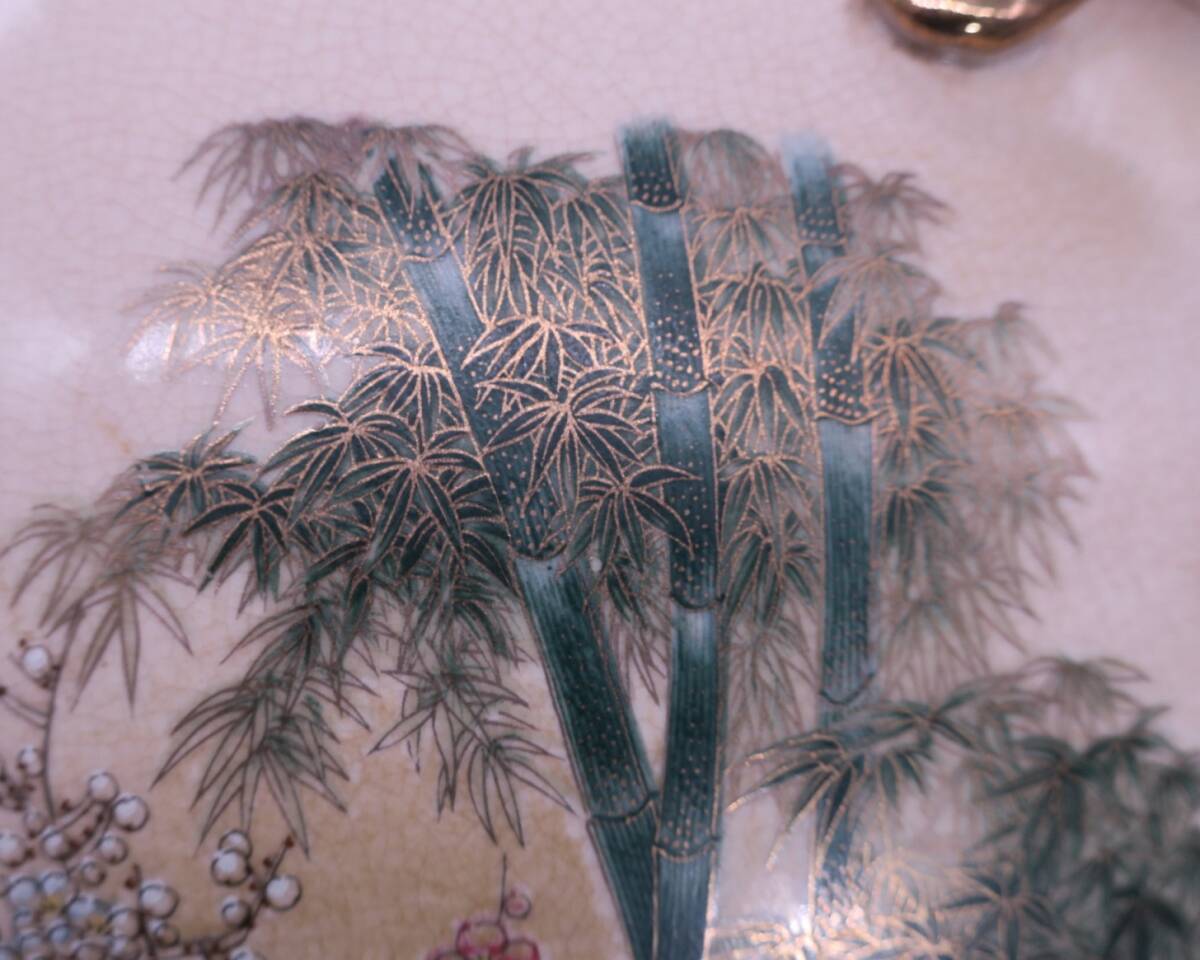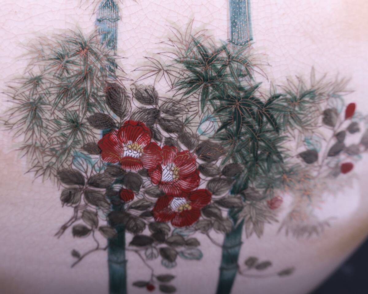 梅、椿、竹林に群れる雀が精細(xì)に描かれており、見(jiàn)ごたえのある一品です。