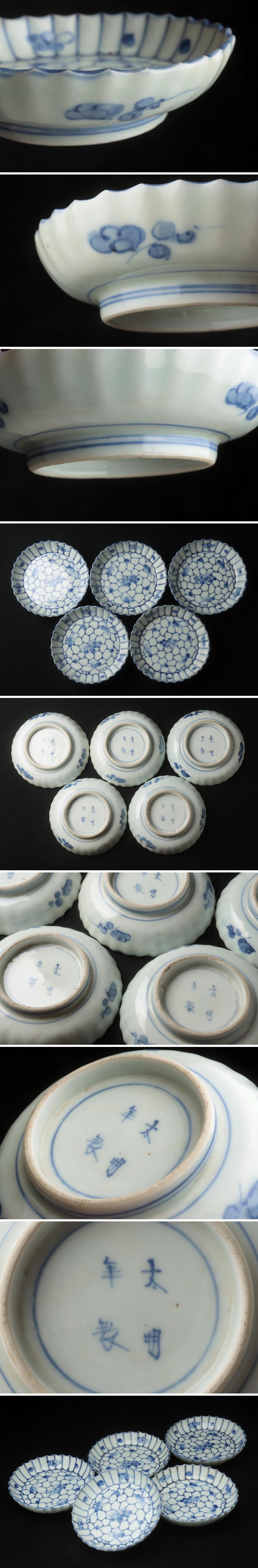 ◆ 時代 古伊萬里 太明年製 染付 梅文輪花皿?青花梅花圖花口皿 五客?青華皿 江戸時代 古美術 古陶磁 ◆ サイズ(約寸) | 外徑 12.5cm 高さ 3.2cm ※5客 [ 60サイズ] | 送料 | 上記の [〇〇サイズ] が配送サイズです。送料表でご確認ください | 狀態(tài) | 窯傷、スレ、シミ、フリモノ、ホツ、縁欠け、経年の汚れ | 入札時の確認 | - 取引規(guī)定をご確認ください