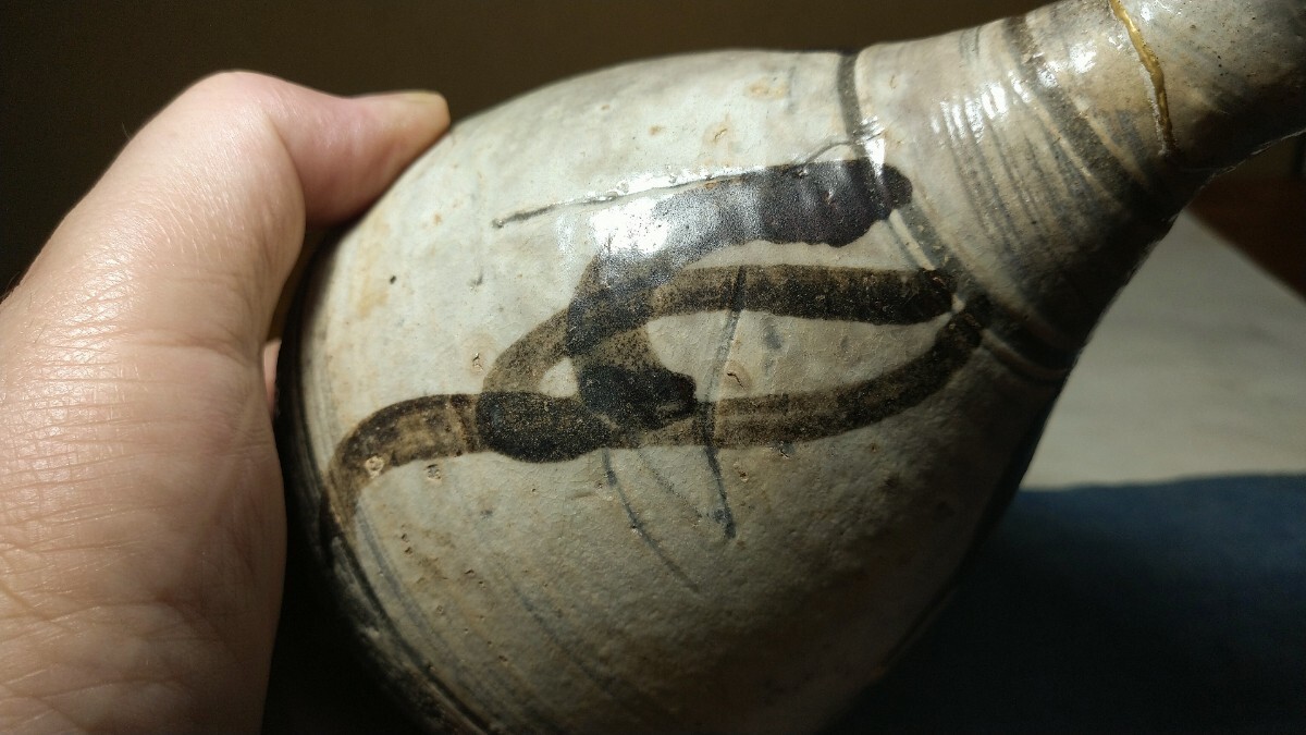 李朝の鶏龍山窯の絵刷毛目羽衣手の徳利です。潤いある艷やかな肌です。ここしばらくの間釉肌の良い酒器サイズの物をほとんど見かけませんでしたが、これならばと落手しました。首は一見共の金継ぎに見えますが刷毛目の繋がりを仔細(xì)に見ると呼び継ぎのようです。色調(diào)や形の面でもまったく違和感はありません。かなりの確率で油に使われている物ですが油もなく內(nèi)部はきれいです。白泥系の物として目覚ましい景色を期待できる李朝鶏龍山絵刷毛目羽衣手徳利を特別出品です。箱、網(wǎng)袋あり。?胴徑11.2センチ?高さ15.8センチ?容量2合4勺?李朝前期 ※新規(guī)の方、評(píng)価の悪い方の入札は取り消す場(chǎng)合があります。商品到著後は速やかに取引ナビの受取連絡(luò)を入れて下さい。