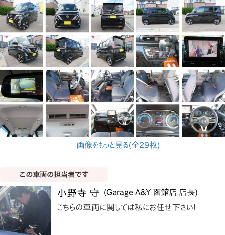 ▼販売店コメント | R.2(2020)年 日産 ルークス ハイウェイスター Gターボ プロパイロットエディション 4WD 純正SDナビ ナビ連動(dòng)ドライブレコーダー ブラック 走行69000km 4WD!プロパイロット!アラウンドビューモニター!両側(cè)電動(dòng)スライド!純正9インチSDナビ 純正エンジンスターター ナビ連動(dòng)ドライブレコーダー ETC エマージェンシーブレーキ ご覧頂きありがとうございます。 ■この車への「お問合せ」?「無料見積り依頼」、「在庫(kù)確認(rèn)」は、お?dú)葺Xにどうぞ! ■この車両以外にも「車選びドットコム」におすすめの中古車を掲載しております。 他の在庫(kù)車種、お店へのアクセスは【販売店情報(bào)ページ】をご覧ください。 問合わせ?來店の際には「中古車情報(bào)サイト(車選びドットコム)を見た」とお伝えください。 店頭商談中?売約済の場(chǎng)合もありますので、ご來店の際は事前にお問合せ頂き、該當(dāng)車両の有無をご確認(rèn)ください。