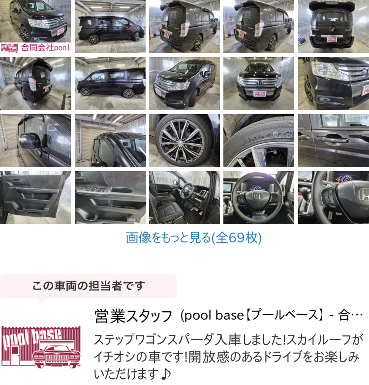 | ▼販売店コメント | H.22(2010)年 ホンダ ステップワゴン 2.0 スパーダ Z 4WD パワースライドドア アルミホイール ナビ ダークパープル 走行156000km ご覧頂きありがとうございます。 ■この車への「お問合せ」?「無料見積り依頼」、「在庫確認」は、お気軽にどうぞ! ■この車両以外にも「車選びドットコム」におすすめの中古車を掲載しております。 他の在庫車種、お店へのアクセスは【販売店情報ページ】をご覧ください。 問合わせ?來店の際には「中古車情報サイト(車選びドットコム)を見た」とお伝えください。 店頭商談中?売約済の場合もありますので、ご來店の際は事前にお問合せ頂き、該當(dāng)車両の有無をご確認ください。