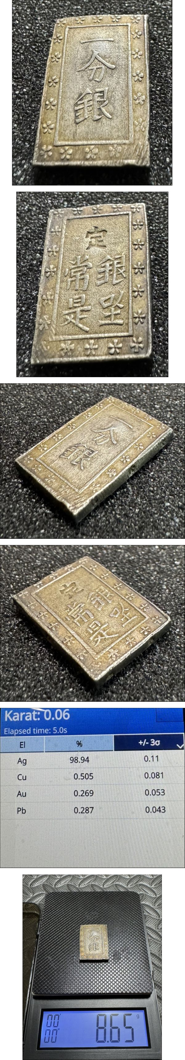 商品説明 | 【商品內(nèi)容】 【本座 天保一分銀 Pt 】 【品位】 銀98.94% 金0.269% OLYMPUS VANTA 蛍光X線分析計(jì)機(jī) (約400萬円)で測(cè)定。 鑑定結(jié)果は寫真に掲載しています。 【量目】:8.65g 【狀態(tài)】: 銀座オークションにて落札した一分銀です。 【本座 天保一分銀 Pt 】となります。 コンディションは寫真でご判斷ください。 現(xiàn)狀で気に入っていただける方のみお願(yuàn)い致します。 計(jì)量器は安価な物ですので多少の誤差はあると思います。 発送は【おてがる配送ゆうパケットポスト】を選んでいただき コインホルダーに入れ、プチプチに包み さらにプチプチ付き封筒に入れて発送いたします。 ◆あくまで個(gè)人保管品です。 畫像にてご判斷いただき、ご納得いただける方のみご入札をお願(yuàn)い致します。 また畫像には限りがございますので、色味が異なる場(chǎng)合などあるかもしれません。 詳細(xì)部分にこだわる方、完璧をお求めになる方、狀態(tài)に神経質(zhì)な方もご遠(yuǎn)慮願(yuàn)います。 商品狀態(tài)に関しては個(gè)人差がございます。 落札後の商品狀態(tài)による返品や故障時(shí)の補(bǔ)償は一切お斷りいたします。 (すり替え防止の為) ◆不要なトラブルを避けるため、3日以內(nèi)のご決済、 速やかな受け取り連絡(luò)をお守り頂ける方のみとしております。 あらかじめご了承ください。 お守り頂けなかった場(chǎng)合、落札者都合キャンセルとさせていただきます。 以上、全てをご了解いただける方のみご入札をお願(yuàn)い致します。 ■新規(guī)の方及び、評(píng)価が低い方の入札は取り消させていただく場(chǎng)合がございます。 ■領(lǐng)収証の発行は対応しておりません。 |