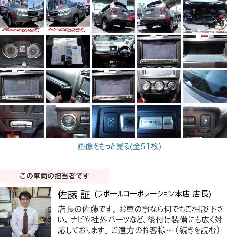 ■ツーオーナー ■禁煙車 ■X-MODE4WD ■デュアルエアバッグ ■ABS ■VDC ■ダウンヒルコントロール ■アイサイトバージョン2 ■衝突軽減ブレーキ ■レーンキーピング ■コーナーセンサー ■アダプティブクルーズコントロール ■アイドリングストップ ■イモビライザー ■スマートキー ■カロッツェリア製メモリーナビ ■フルセグ地デジチューナー ■ミュージックサーバー ■CDDVDSDカードスロットル ■ブルートゥース ■USB入力 ■カラーバックモニター ■ETC ■オートライトコントロール ■ディスチャージヘッドライト ■フロントフォグライト ■リアフォグライト ■ヘッドライトウォッシャー ■オートワイパー ■デュアル切り替え機(jī)能付きオートエアコン ■フロント熱線ウィンドウ ■運(yùn)転席パワーシート ■助手席パワーシート ■フロントシートヒーター ■プライバシーガラス ■ロゴ入りキッキングプレート ■トノカバー ■ウィンカードアミラー ■純正ルーフスポイラー ■純正17インチアルミホイール ■取扱説明書完備